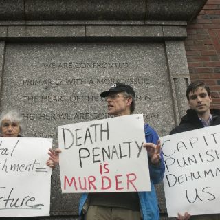 Unos 15 manifestantes en contra de la pena de muerte se congregaron frente al tribunal, exhibiendo carteles donde afirmaban: ¿Por qué matamos nosotros a gente que mata gente para mostrar que matar no está bien?".