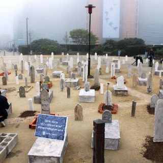 Instalan 'cementerio de niños' frente a sedes de la UE