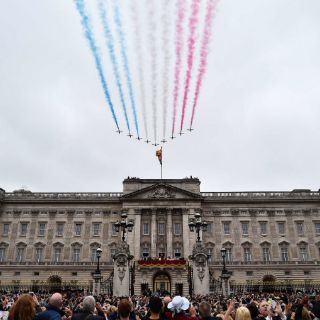 El príncipe Jorge, primogénito de Guillermo y Catalina, de dos años de edad, fue visto asomado a una ventana durante el desfile y se unió después al resto de la familia real en el balcón del palacio de Buckingham para contemplar la exhibición aérea.