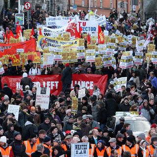 Mientras tanto, miles de manifestantes marcharon por la capital irlandesa contra el acuerdo, que líderes de la UE esperan evite que la crisis se extienda a Portugal y España, amenazando el futuro del euro.
