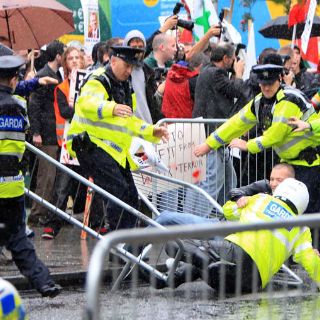 Unos 200 activistas que gritaban que Blair tenía en las manos “tinta de sangre” se reunieron afuera de Eason, una librería en la calle O'Connell de Dublín, en donde los inconformes se enfrentaron con la Policía, que había colocado una barrera de seguridad.