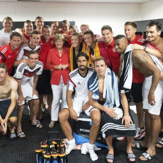 La imagen en los vestidores donde aparece Merkel rodeada de los jugadores, algunos de ellos sin camiseta, fue tomada por el fotógrafo oficial del gobierno alemán, Guido Bergmann.