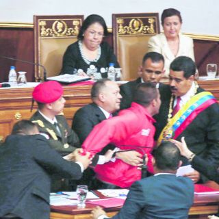 El nuevo mandatario fue interrumpido por un hombre vestido de rojo que se arrojó sobre él para pedirle ayuda. “Ha fallado la seguridad, absolutamente. Me pudieron haber dado un tiro aquí”, dijo Maduro ante la mirada de los 17 jefes de Estado y de Gobierno que asistieron a la ceremonia, entre ellos, el iraní, Mahmoud Ahmadinejad; el cubano, Raúl Castro; el colombiano, Juan Manuel Santos; la argentina, Cristina Fernández, y la brasileña, Dilma Rousseff.