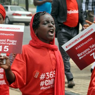 Nigeria, para protestar tras cumplirse un año del secuestro de 276 niñas en una escuela de su comunidad, perpetrado por el grupo extremista
