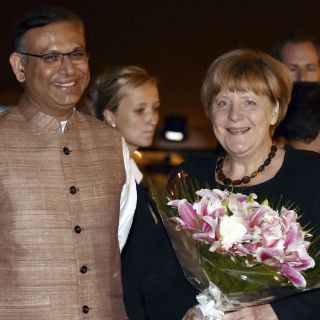 Merkel fue recibida con un ramo de flores de manos del viceministro de Finanzas indio, Jayant Sinha, al descender del avión en la capital india.