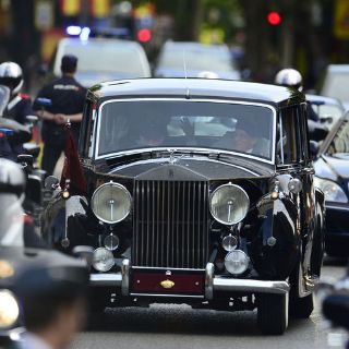 Los nuevos reyes viajan en un Rolls-Royce de época de Patrimonio Nacional, escoltados por la guardia motorizada, en un trayecto flanqueado con fuertes medidas de seguridad.