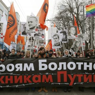 Algunos de los manifestantes marcharon el domingo con retratos de los manifestantes presos y una pancarta que leía: "Libertad a los héroes de Bolotnaya, los rehenes de Putin".