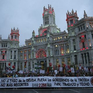 ''Ni paro, ni exilio, ni precariedad. Marchas, marchas, por la dignidad'', coreaba la multitud, convocada por plataformas ciudadanas, sindicatos, pequeños partidos de izquierda y colectivos de defensa de los servicios públicos o el derecho a la vivienda, mientras marchaban juntos hacia la emblemática plaza de la Puerta del Sol, enarbolando banderas republicanas, globos rojos y banderines sindicales.