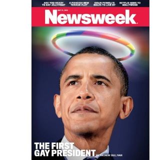 La portada de la edición de Newsweek del 21 de mayo muestra una foto del presidente con una aureola en arcoiris. El arcoiris es el símbolo que han elegido para sus banderas los grupos militantes de homosexuales, bisexuales y transexuales.