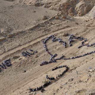 El dibujo humano se creó bajo la dirección del reconocido artista John Quigley en las faldas del Monte de las Tentaciones, en Jericó, considerada la ciudad más antigua poblada del mundo