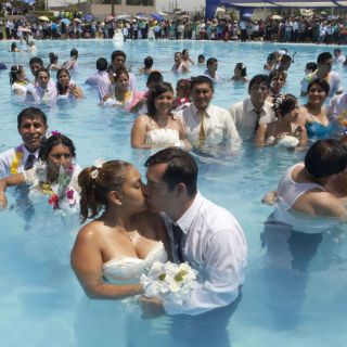 LIMA, PERÚ (14/FEB/2013).- En el día de San Valentín, 24 parejas peruanas se dieron el "sí" en una boda colectiva frente al mar que incluyó un romántico paseo en bote por la bahía limeña, y hasta un chapuzón.