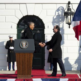 Francois Hollande arribó a la Casa Blanca por la mañana, donde fue recibido por Barack Obama y la primera dama Michelle Obama. Los presidentes, abrigados en una fría mañana de febrero, escucharon los himnos nacionales interpretados por una banda militar.