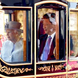 La principal avenida del palacio real se viste de colores con las banderas rojas chinas junto a las de la "Union Jack" de Reino Unido en el marco de la visita del líder comunista, quien fue recibido entre aplausos y abucheos del público, entre ellos activistas pro-derechos humanos.