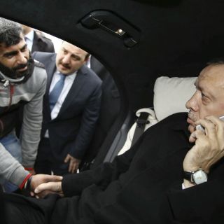 Erdogan no sale del auto y mantiene su teléfono celular pegado a su oído, pero el hombre introduce la cabeza por la ventanilla y se les ve conversar.