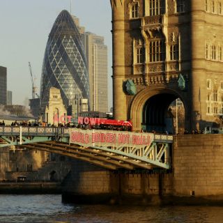 Entretanto, en el emblemático puente de la Torre de Londres (Tower Bridge) los organizadores colgaron un cartel de 25 metros con la leyenda "Bridges not Walls" (Puentes no muros).