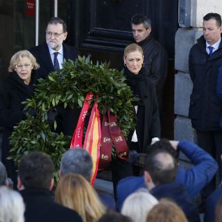 El presidente del gobierno en funciones, Mariano Rajoy, encabezó el homenaje a los fallecidos y heridos en la Puerta del Sol, acompañado de la presidenta de la Comunidad de Madrid, Cristina Cifuentes, y la alcaldesa Manuela Carmena.