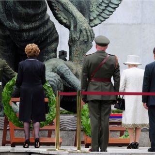 La Reina colocó una corona de flores en el Jardín de la Memoria de Dublín, el monumento irlandés a los caídos, ante una multitud de dignatarios, soldados y su esposo, el duque de Edimburgo, cuyo tío fue asesinado por irlandeses nacionalistas en 1979.