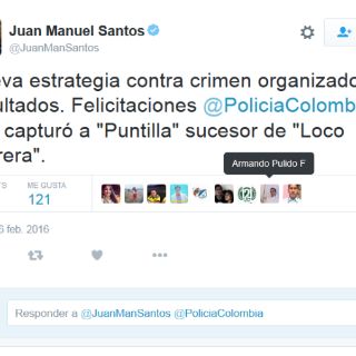 "Nueva estrategia contra crimen organizado da resultados. Felicitaciones @PoliciaColombia que capturó a 'Puntilla' sucesor de 'Loco Barrera''', escribió el mandatario en la red social.