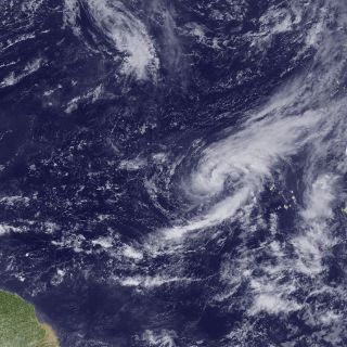 Se encuentra a unos 725 kilómetros al oeste-noroeste de las islas de Cabo Verde, en la latitud 18.0 grados norte y la longitud 30.5 grados oeste, y arrastra vientos máximos sostenidos de 75 kilómetros por hora.