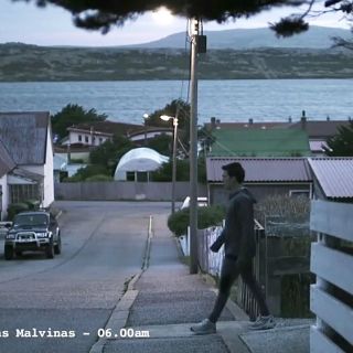 "Para competir en suelo inglés entrenamos en suelo argentino", indica el aviso luego de mostrar al deportista entrenando frente a las fachadas de varios establecimientos de las islas, como "Globe Tavern" y el diario "Penguin News".