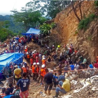 Unas 400 personas entre rescatistas, militares, familiares de los mineros y curiosos, se aglomeraron alrededor del sitio, donde se encuentran varias bocas de minas de oro cubiertas con toldos azules, en medio de un sol pesado y nubes que amenazan con lluvia.