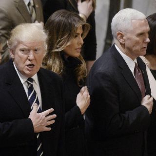 Trump, su esposa Melania, el vicepresidente Mike Pence y su esposa Karen ocuparon la primera fila en la Catedral Nacional en Washington durante el servicio matutino que siguió a la jornada de ritos, pompa y protestas de su investidura.