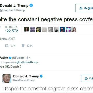 "Pese a la constante 'covfefe' negativa de la prensa", tuiteó a las 00:06 Trump, quien presumiblemente quiso escribir "coverage" (cobertura), en lugar de la palabra inexistente "covfefe".