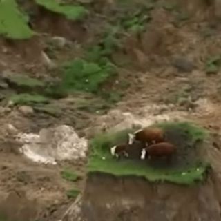 Un video del servicio de noticias Newshub, tomado desde un helicóptero en la localidad de Kaikoura, mostró a dos vacas adultas y una ternera en el pedazo de tierra que quedó aislado, en medio de zanjas que les impedían bajar.