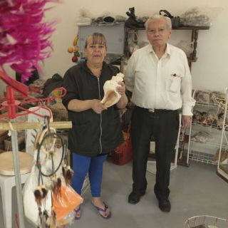 GUADALAJARA, JALISCO (02/MAR/2016).- María Elena Flores y Arturo Navarro sacuden por enésima vez los anaqueles de su local de artículos para danzantes mientras acomodan su mercancía. Todavía no terminan de desempacar pero ya exhiben en su nuevo espacio mulas, plumas, caracoles y cascabeles.