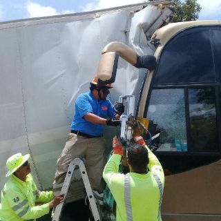 El contenedor de un tráiler se soltó e impactó de frente a un autobús de pasajeros