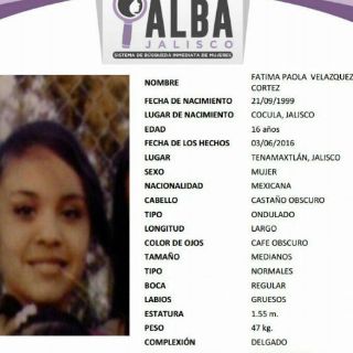 GUADALAJARA, JALISCO (09/JUN/2016).- Este jueves autoridades activaron el Protocolo Alba Jalisco para buscar a Fátima Paola Velázquez Cortez, de 16 años, quien desapareció el pasado 3 de junio.