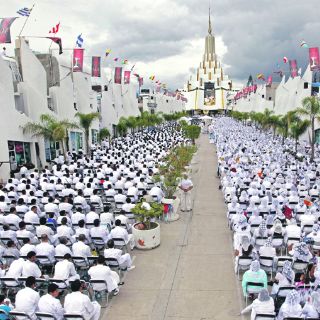 GUADALAJARA, JALISCO (15/AGO/2012).- La tarde de un día nublado fue propicia para un clima templado. Así, el calor no fue impactante para quienes estaban a cielo abierto en una gran concentración humana en la ceremonia de la Santa Cena, el día más importante de los festejos de la Santa Convocación de la Iglesia de la Luz del Mundo, en la Colonia La Hermosa Provincia, al Oriente de la ciudad.