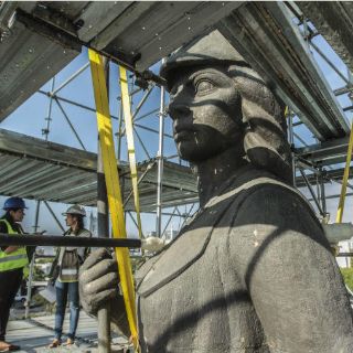 GUADALAJARA, JALISCO (20/ABR/2017).- Con un “esqueleto nuevo” y las grietas externas soldadas, La Minerva será unida nuevamente a su pedestal, para posteriormente ser limpiada y protegida con una capa de pintura; son los pasos finales de la tercera y última etapa de su rehabilitación.