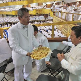 De acuerdo con los responsables de la organización de ésta, la máxima ceremonia de la Semana de la Santa Convocación de la Luz del Mundo, en el templo central hay 13 mil personas escuchando a Samuel Joaquín Flores, a la espera de recibir el pan y el vino de la cena.