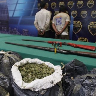 Un subinspector de la Policía estatal explicó que un grupo de patrulleros que circulaban por el citado camino de terracería, observaron a los dos hombres armados, quienes custodiaban un secadero de mariguana, además de 90 kilos del enervante que tenían en costales.
