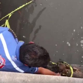 Bomberos rescatan a perro que cayó a canal de Tlajomulco
