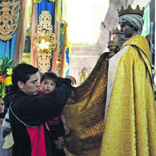 Están frente a ellos. Sus papás los abrazan para que los vean mejor. En uno de los pilares del templo hay un letrero que dice “tocamientos sólo menores de tres años”. José, un joven de 17 años le pregunta cuántos años tiene a Daniel. Él levanta la mano y extiende sus cinco deditos. Su mamá le cierra el puño, entonces le quita la chamarra. Carmelita, de 80 años, quien junto con José se encarga de controlar que sólo niños menores de 36 meses toquen las figuras, toma el suéter de Daniel y lo frota por el cuerpo de cada uno de los santos reyes; lo mismo hace con las carteras y bolsas que los devotos le entregan, pues según la tradición esto basta para atraer las bendiciones que fueron a llevarle al Niño Jesús, materializadas en oro, incienso y mirra.