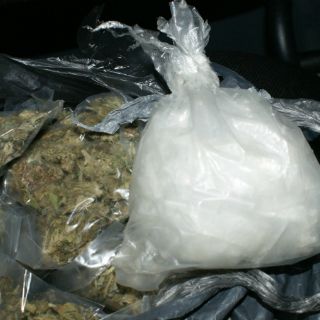 Al revisar la camioneta se aseguró en el compartimiento que se localiza en medio de los asientos delanteros, una bolsa de plástico con 100 envoltorios de plástico transparente, los que a su vez contenían gránulos cristalinos, al parecer cristal, con un peso total aproximado de 50 gramos, y en la parte trasera donde va la llanta de refacción, aseguraron una bolsa de plástico color gris, la cual contenía 50 envoltorios de plástico transparente en donde traían mariguana, con un peso total de 500 gramos.