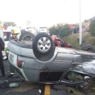 En el percance se vieron involucrados dos vehículos, una camionta tipo suv roja y un auto compacto color plata, mismo que terminó volcado sobre su toldo luego del choque.