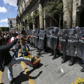 Empezaron las consignas contra el PRI, contra Aristóteles Sandoval, contra Enrique Peña Nieto. Los gritos encendían a los jóvenes, los grandes se comenzaron a disgregar. Terreno listo para los estudiantes. Un par de ellos comenzó a instigar a los policías e incitaron a los demás a lanzarles objetos, les festejaban cada botella que se estrellaba contra su cuerpo.
