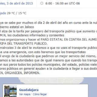 La invitación del grupo en la red social está redactada como sigue: "El día miércoles 3 de abril te invitamos a que no uses el transporte público a menos que sea una emergencia, con esto haremos que los transportistas vean el enojo de la ciudadanía que pedimos un mejor servicio del mismo".