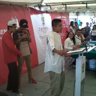“No dejes escapar la oportunidad para que tus metas puedas alcanzar, jóvenes con porvenir…”, termina su canción y la gente le aplaude, entre ella, el alcalde de Zapopan, Héctor Robles Peiro.