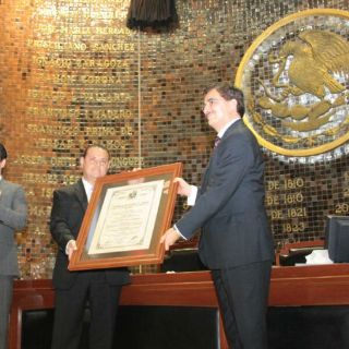 El rector de la Máxima Casa de Estudios, Tonatiuh Bravo Padilla recibió de manos del presidente del Congreso, Héctor Pizano el pergamino que contiene el decreto en el que el Poder Legislativo le otorgó a la Universidad de Guadalajara el grado de benemérita.