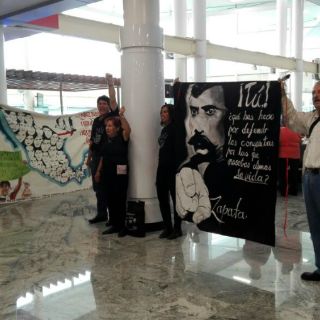 Con tres mantas, docentes y padres de familia recorrieron el área de espera de salidas internacionales lanzando consignas en contra de la reforma educativa.