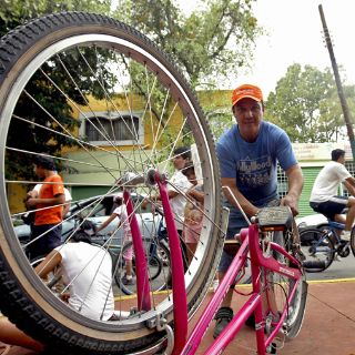 En un domingo normal, el pequeño e improvisado taller de bicicletas atiende a unas 100 personas. Muchas le pagan, otras no.