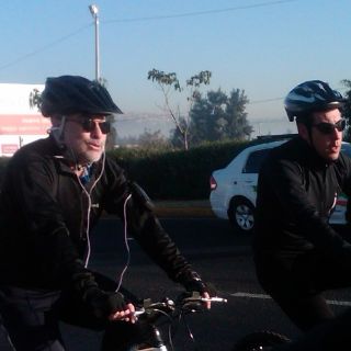 Con ropa deportiva, casco y hasta un reproductor de música en el brazo, ambos partieron sobre carretera a Chapala, acompañados de otros ciclistas, su seguridad privada y una patrulla de la Secretaría de Vialidad y Transporte (SVyT).