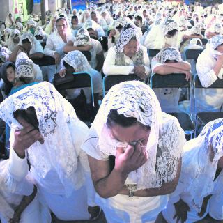GUADALAJARA, JALISCO (15/AGO/2014).- Alabanzas, oración y llanto. Ayer la Iglesia de La Luz del Mundo se vistió de blanco. Trajes, faldas, velos, bancas, sillas y hasta las sombrillas que arroparon a los feligreses se uniformaron.