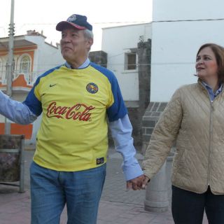 TONALÁ, JALISCO (09/ABR/2012).- Con la camiseta del equipo capitalino, América --como pago de una apuesta-- el candidato a la gubernatura, Fernando Guzmán Pérez Peláez, cruzó de la mano de su esposa Natividad de Anda, la Plaza Secundaria de la Delegación San Gaspar, en el municipio de Tonalá.