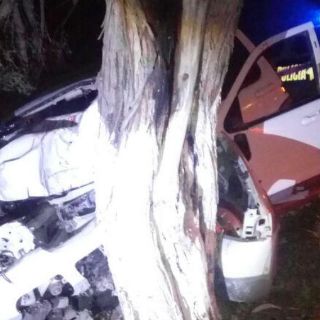 En en el lugar una camioneta blanca, modelo Expeditión, impactó de frente contra un árbol y destruyó por completo el frente de la camioneta.