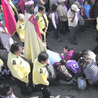 María de Jesús Manzo es una de las casi un millón de personas que asistió a la edición 426 de las fiestas de los Reyes Magos, de Cajititlán, comunidad de Tlajomulco de Zúñiga. Ella está afuera del templo, en el atrio, y dentro de las líneas de las sogas. Ahí, espera junto con su hija de tres años, Jennifer Guadalupe Marín, la salida de las esculturas para inclinarse y tratar de tocar, mientras pasan por su cabeza, la base o la capa de una de las tres figuras.